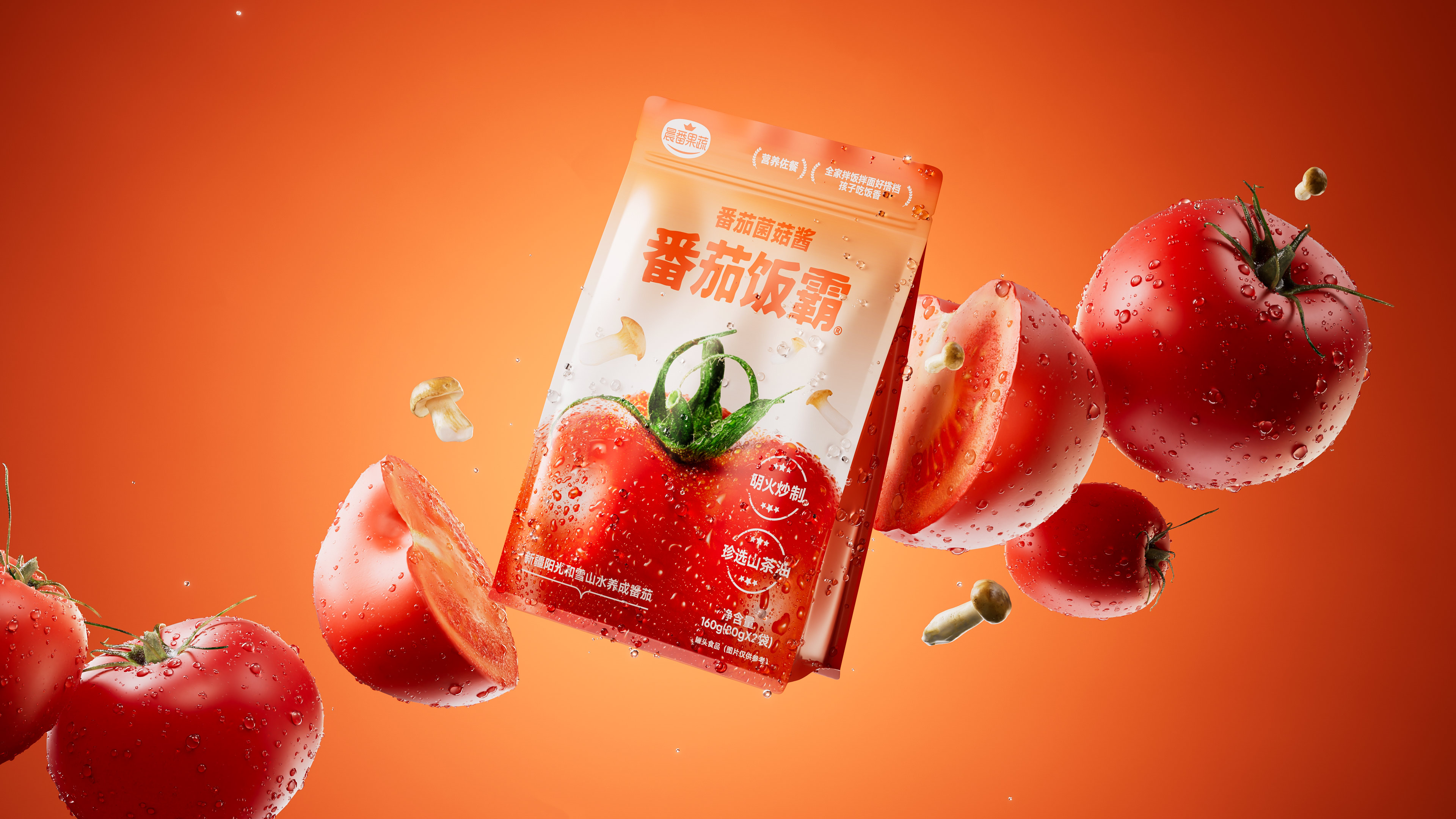 以“健康+美味”营养佐餐的差异化定位,跳出传统拌酱的红海竞争,精准切入拌饭酱市场。在发起产品口味多轮研发测评后,借助与产品优势强关联的命名“番茄饭霸”,以及包装视觉上“食欲感+健康感+新疆印记”的三重表达,使其产品在货架上具备极强的识别力与购买欲,提升在消费者心中的认知定位,助力晨番果蔬加速实现从B2B原料供应商向C端消费品牌的战略转型。
